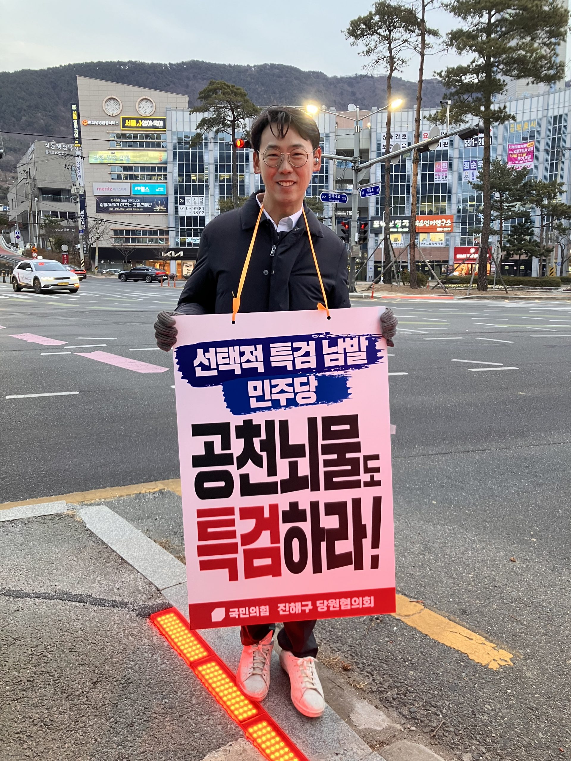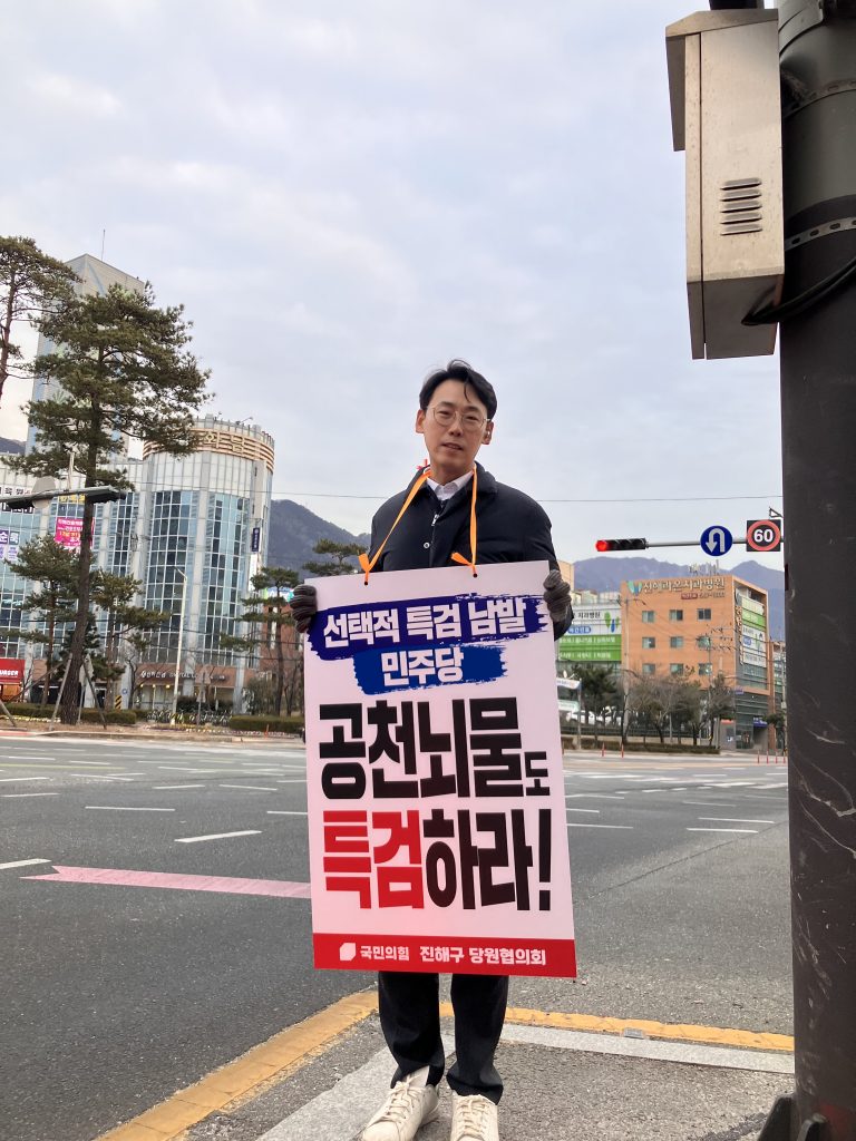 1월 26일 오후 5시부터 6시까지, 나는 국민의힘 진해구 당원협의회 청년 당원 자격으로 진해 롯데시네마 사거리에서 1인 활동을 진행했다. 최근 정치권에서 논란이 되고 있는 특검 추진 방식과 형평성 문제에 대해, 청년의 시각에서 직접 문제를 제기하고 시민들과 마주 서보고 싶었다.