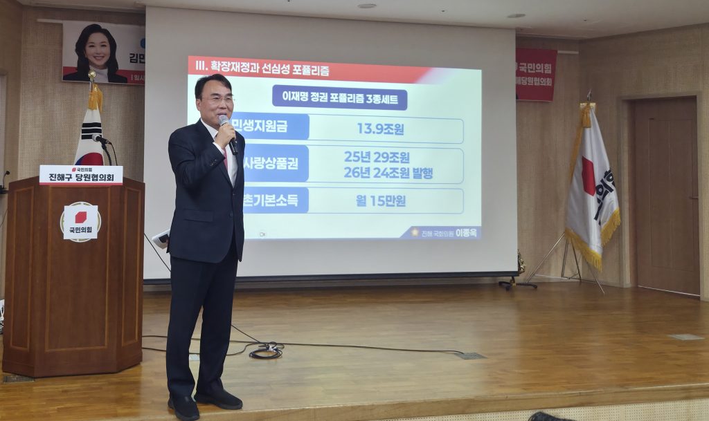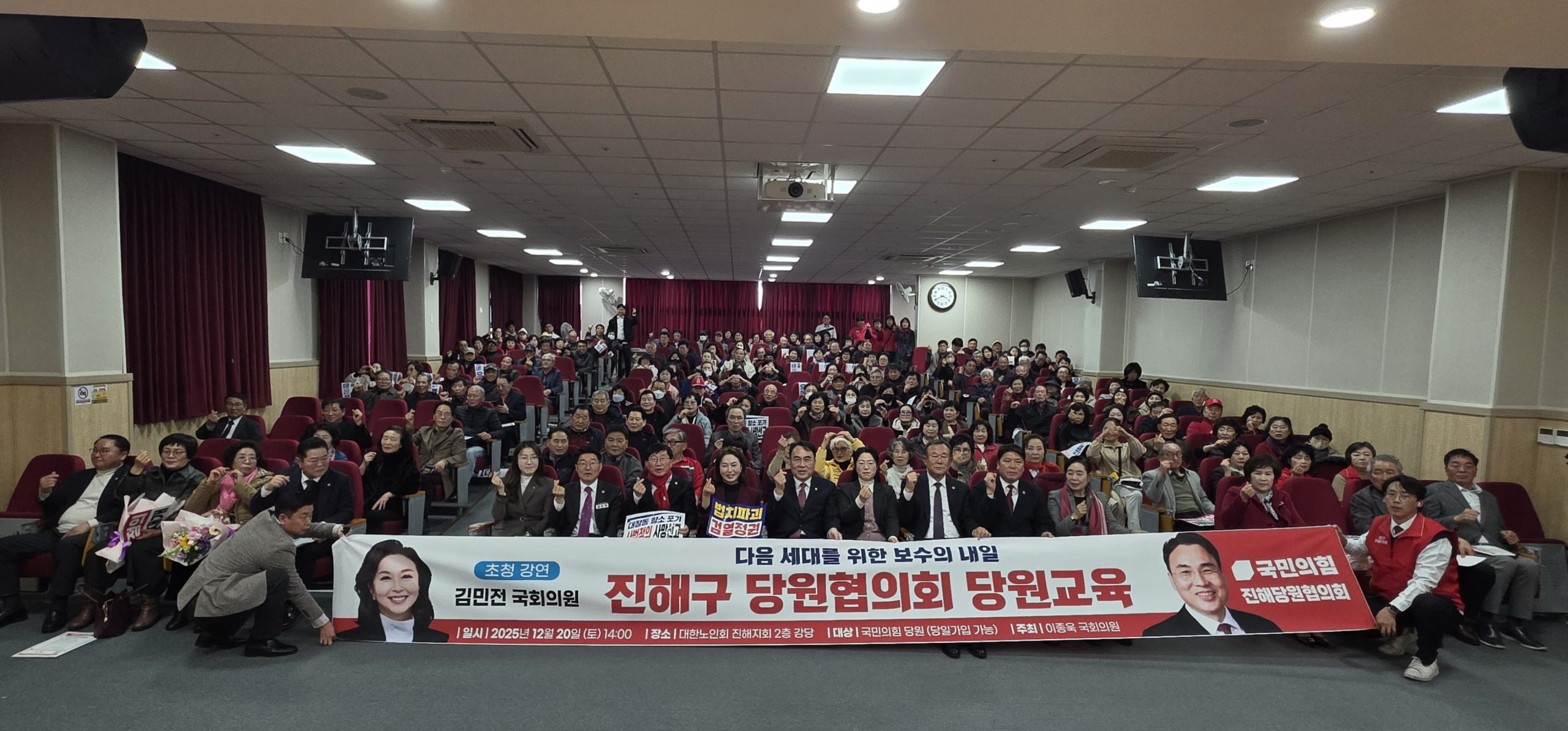 12월 20일, 진해구 당원협의회 당원교육이 열렸으며 이종욱 국회의원과 김민전 국회의원이 직접 강의를 진행하였다. 두 의원은 현재 정국과 향후 과제, 그리고 지역 정당조직의 중요성을 설명하며 당원 한 사람 한 사람이 대한민국의 미래를 바꾸는 주체임을 강조하였다.