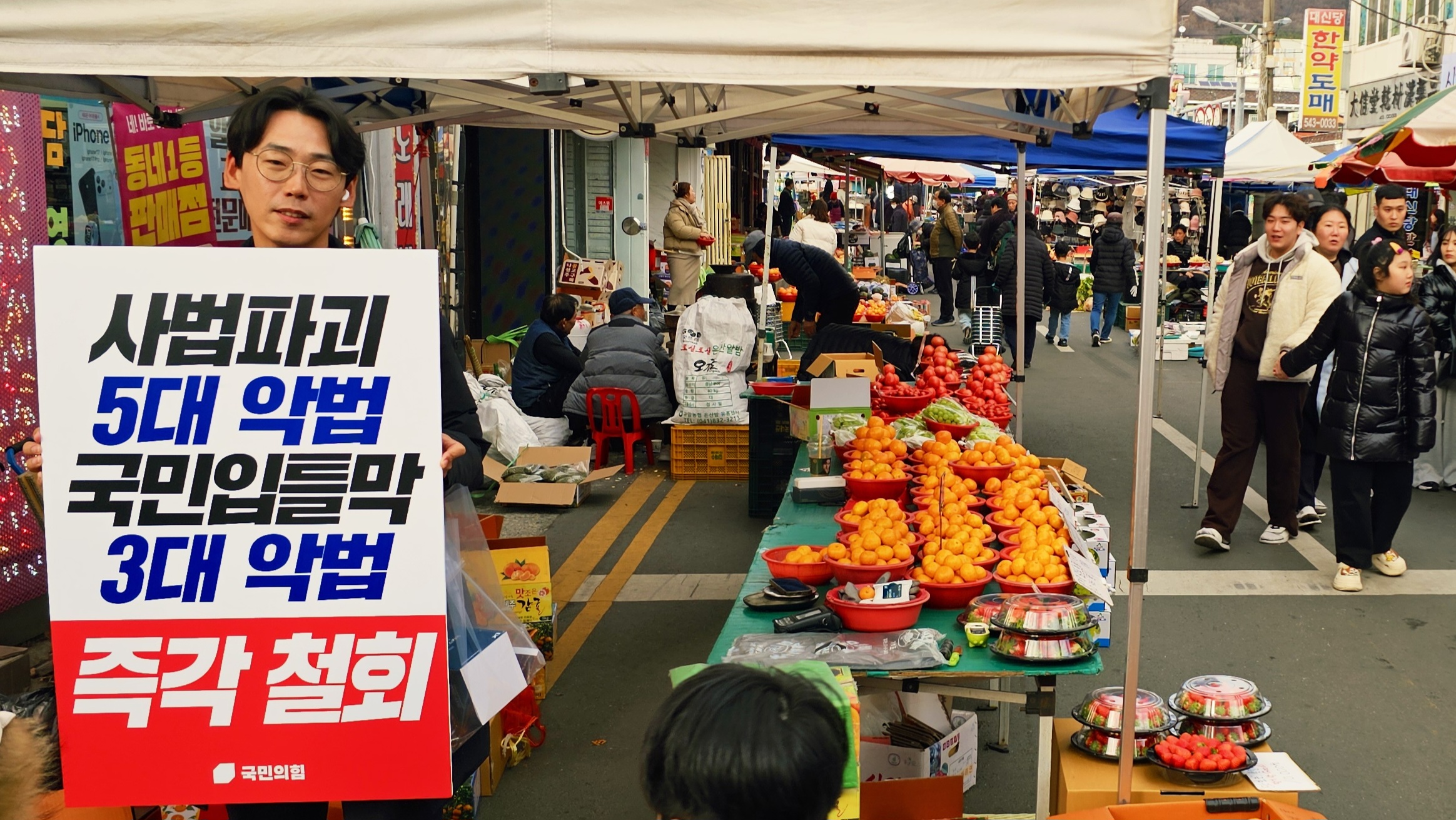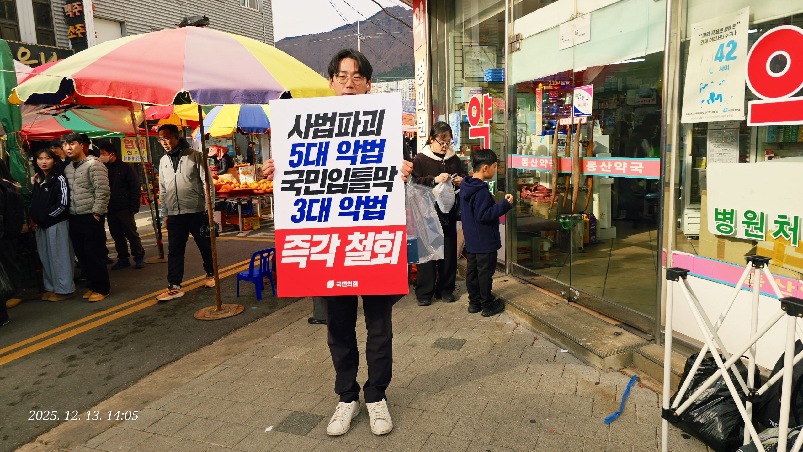 12월 13일, 매서운 겨울바람이 얼굴을 때리던 오후, 경화시장 모퉁이에 혼자 섰다. 사람들로 북적이는 장날 한가운데에서, 두 손으로 피켓을 번쩍 들고 서 있는 내 모습이 스스로 봐도 조금은 우스꽝스러워 보였지만, 그래도 오늘만큼은 물러설 수 없다는 생각뿐이었다. 사법파괴 5대 악법과 국민입틀막 3대 악법을 규탄하는 문구가 적힌 피켓을 든 채, 벌을 서는 아이처럼 조용히 서 있었지만, 마음속에서는 이 나라의 법과 상식이 더 이상 무너지지 않기를 바라는 절규가 거세게 울리고 있었다.